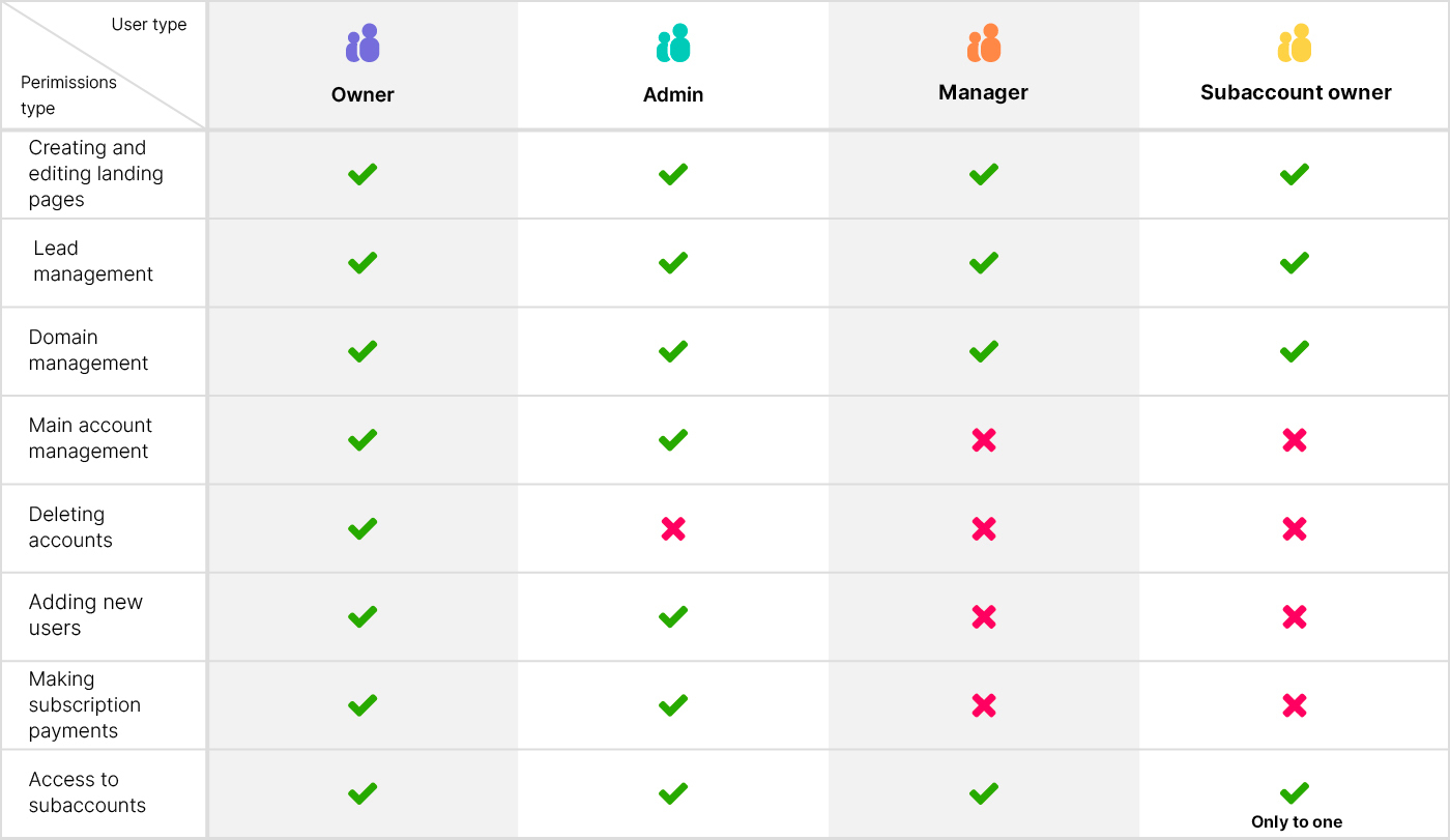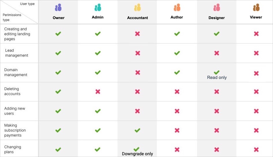 In the Landing platform, we distinguish several types of users. Below you can view user permissions depending on your plan.