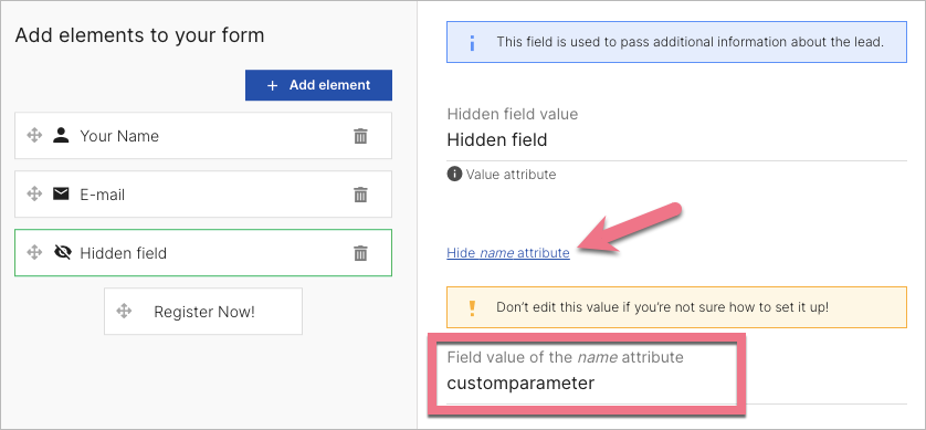 If your landing page URL with custom parameters is: https://www.landpage.co/utm/?ref=website&name=Gilbert, in the Field value of the name attribute field, add ‘ref’ and ‘name’ respectively.