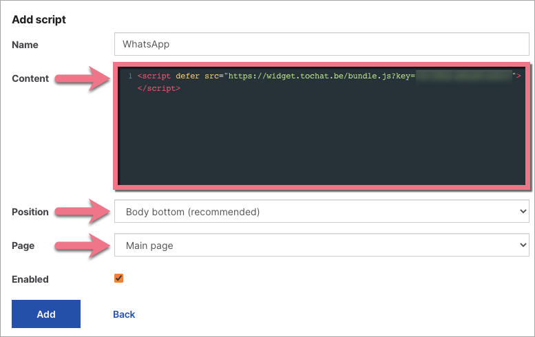 3. Name the script and paste the copied code in the Content field. Choose Body bottom position and Main page. Save by clicking Add.