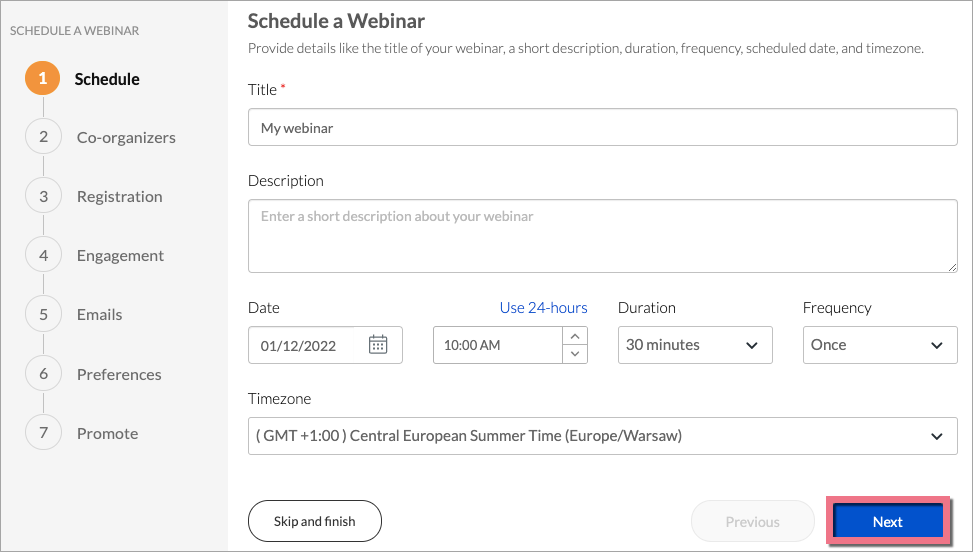 3. If you choose a webinar, fill in the fields and click Next to go through scheduling a webinar.