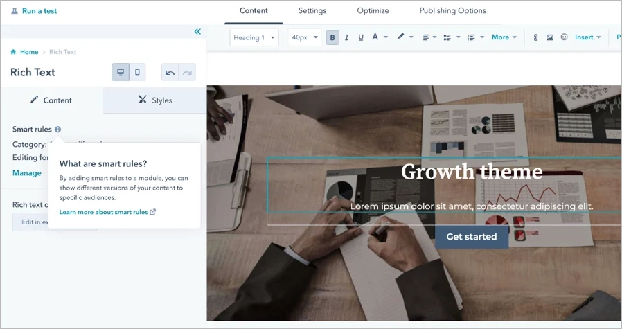 In HubSpot la personalizzazione è forte ma più strutturata. È possibile creare temi e moduli personalizzati, ma i layout seguono ancora blocchi e griglie orientati alla coerenza del marchio piuttosto che alla totale libertà visiva.