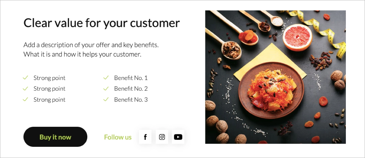Check out Landingi’s template and customize it with the drag-and-drop editor to create the best click-through landing page for your healthy products.