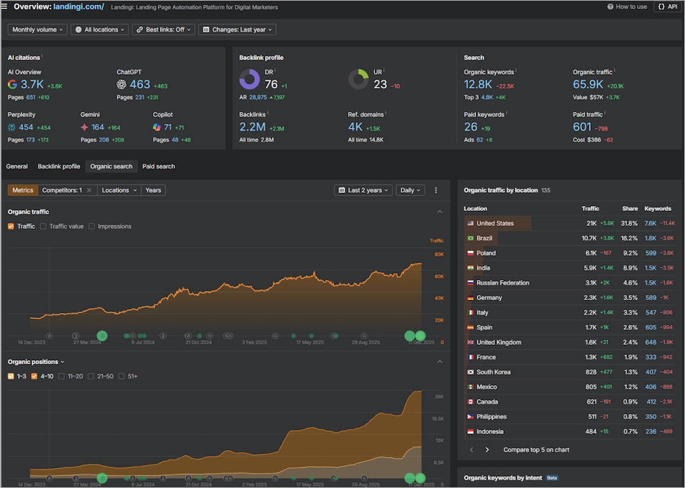 It reached more readers and gained stronger visibility across markets. Ahrefs data shows year-over-year growth in both traffic and keyword positions, especially around topics marketers look for when they want to understand what actually works: landing pages, conversions, AI workflows, and optimization.