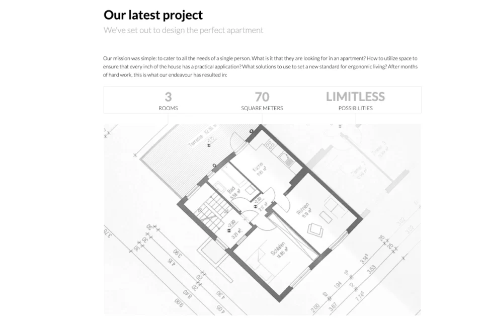Po pierwsze – dobre zdjęcia. Każdy, kto szukał mieszkania w internecie czy mediach społecznościowych, spotkał się zapewne z ofertami, które posiadały mało zdjęć, na dodatek niskiej jakości. Takie rozwiązanie nie zwiększa zainteresowania. Zdjęcia na landing page’u możesz rozmieszczać, jak chcesz. Ważne, aby pokazywały mieszkanie w możliwie najlepszym świetle. Nie zapomnij o zdjęciu planu mieszkania – potencjalny klient bardzo to doceni.