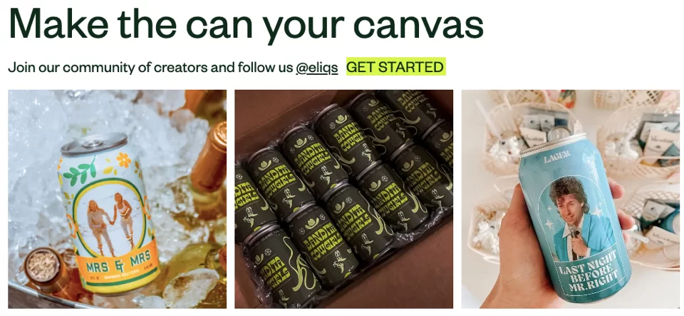 To kolejny przykład pokazujący, jak można wykorzystać personalizację w branży e-commerce. Marka Eliqs pozwala swoim klientom zaprojektować design puszek napojów, które następnie można zakupić na specjalne okazje, np. wesela czy wieczory panieńskie/kawalerskie. Czego możesz nauczyć się z tego landing page’a? Aby sprzedawać produkt, nie musisz mówić o cechach produktu i korzyściach przedstawianej oferty. Zamiast na tradycyjnym promowaniu skup się na budowaniu kreatywnej społeczności, która w Twoim produkcie zobaczy przede wszystkim inspirację i płótno, które może zapełnić własną twórczością.