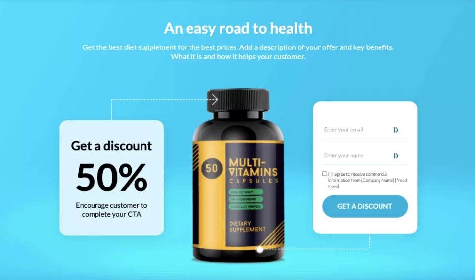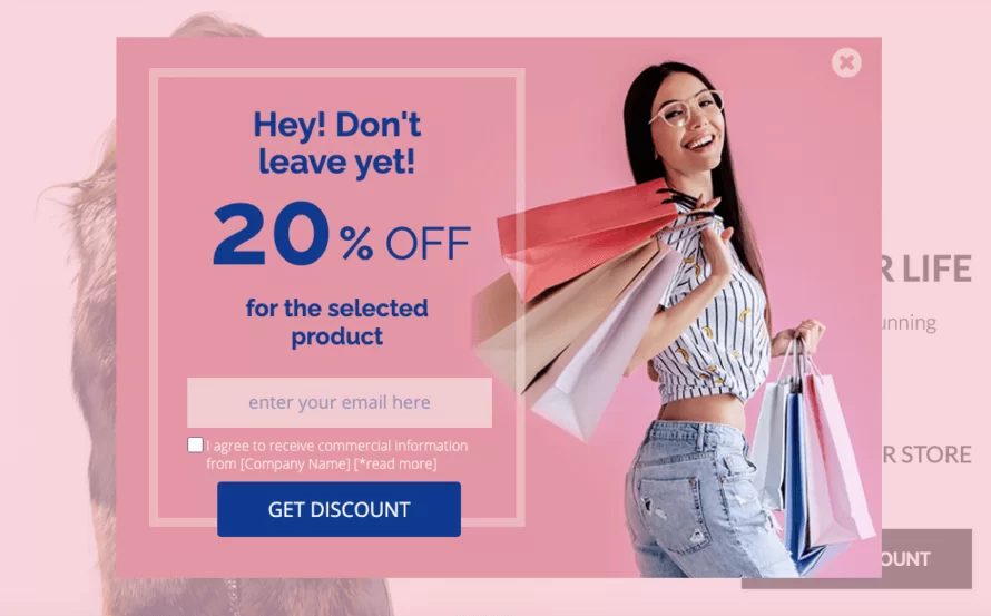 Przykład: odwiedzający przegląda landing page i nie decyduje się wykonać celu. Czy to już koniec nadziei na konwersję i czas na skupienie się na remarketingu? Niekoniecznie. Masz jeszcze jedną szansę na przyciągnięcie uwagi klienta. Pomoże Ci w tym pop-up ze zniżką. Nie może ona być byle jaka – w końcu to moment, w którym wytaczasz najcięższe działa, skoro wszystkie inne próby na landing page’u zakończyły się niepowodzeniem.