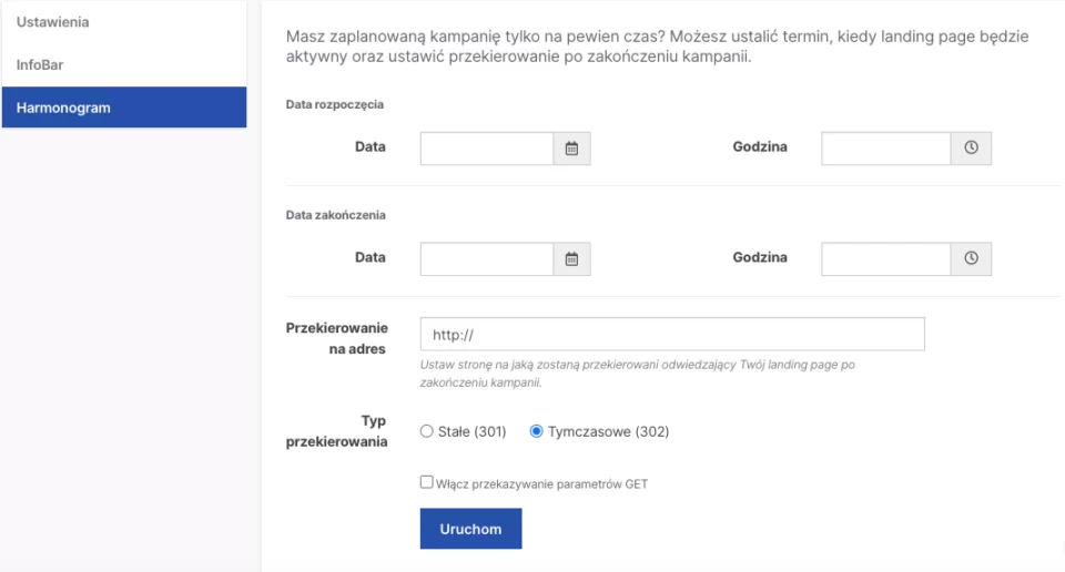 Połącz start i koniec kampanii z reklamami, które przekierowują na Twojego landing page’a (na przykład te z Google Ads). Dzięki temu nie musisz martwić się o to, że Twoje strony docelowe działają wtedy, gdy kampania jest już wyłączona.