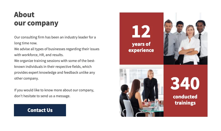 Zależy Ci na większej liczbie klientów? To oznacza reklamowanie się wśród osób, które nie miały styczności z Twoją firmą. Dlatego też Twój landing page powinien zawierać sekcję, w której opiszesz, czym zajmuje się Twoja firma, aby Twoi potencjalni klienci mogli poznać Cię lepiej.