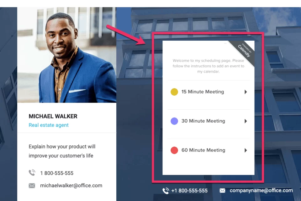 Korzystasz z narzędzi do umawiania spotkań, na przykład Calendly lub HubSpot? Połącz je z landing page’em. Dzięki temu odwiedzający będą mogli wybrać datę spotkania bez konieczności opuszczania strony docelowej. Sekcja powinna wyglądać mniej więcej sposób pokazany na przykładzie: