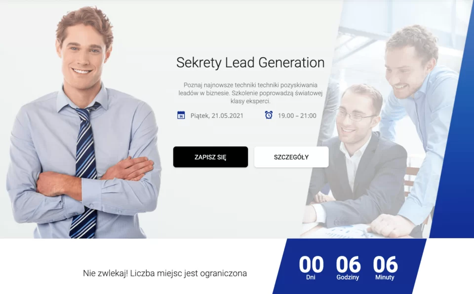 Akcje marketingowe bardzo często są ograniczone czasowo. W jaki sposób najlepiej zaznaczyć upływający czas i zachęcić do skorzystania z konkretnej oferty? To proste: dodaj do landing page’a licznik, który zmotywuje odwiedzających do skorzystania z oferty, zanim będzie za późno.