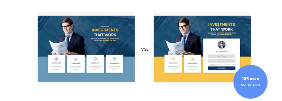Test A/B jest jednym z najpopularniejszych sposobów na zwiększenie skuteczności stron docelowych. Polega na wprowadzeniu jednej zmiany na landing page’u oraz publikacji zmodyfikowanej wersji, która będzie wyświetlana części odbiorców. W ten sposób jesteś w stanie zweryfikować, czy proces optymalizacji strony idzie w dobrym kierunku.