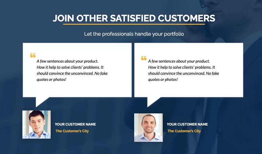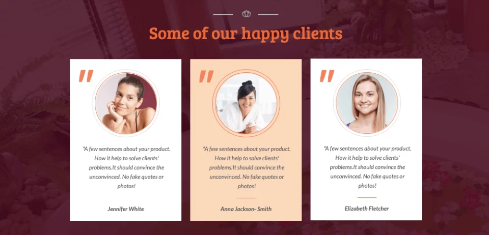 Pozytywne opinie osób, które wcześniej skorzystały z produktu lub usługi, wzmocnią dobre wrażenie, dlatego należy pamiętać o sekcji, takiej jak ta, która dostępna jest na jednym z naszych szablonów strony docelowej: