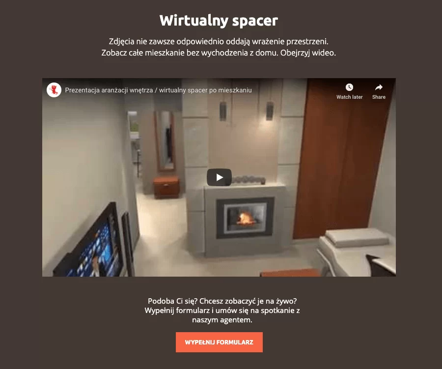 Coraz więcej osób decyduje się na dodanie do strony docelowej filmu, w którym pokazane jest całe mieszkanie od A do Z. Nie jest to czasochłonny proces, a zwiększa wartość oferty pod względem wygody dla odwiedzającego i jego doświadczenia (user experience). Zwiększa też uwagę użytkownika. Wrzucenie wideo z serwisu YouTube na stronę lądowania to tylko kilka kliknięć, a landing page sporo na tym zyskuje.