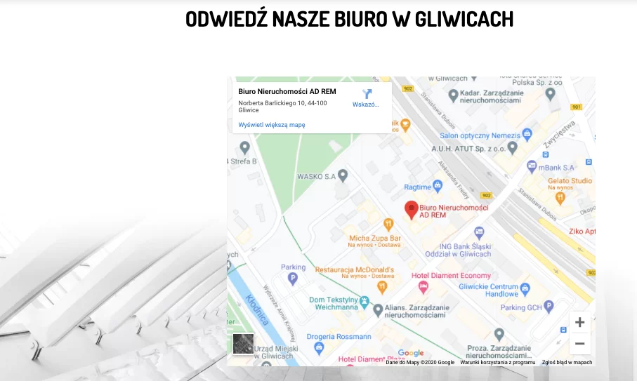 Landing page ma zawierać najważniejsze informacje i przekazywać je w przejrzysty i wygodny sposób. Chcesz ułatwić dojazd do oferowanego mieszkania lub do siedziby Twojej firmy? Podanie adresu to plan minimum. Lepszym rozwiązaniem będzie dołączenie widżetu z mapą Google. Zobacz na przykładzie, jak powinna wyglądać taka sekcja:
