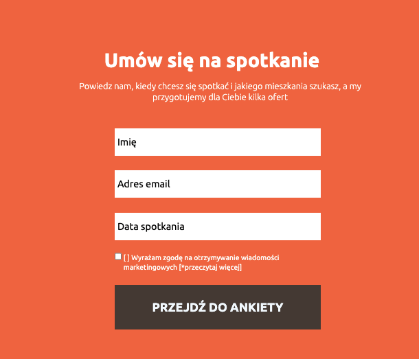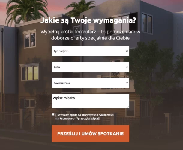 Możesz rozłożyć proces na kilka części, tworząc lejek. Pierwszy etap powinien zawierać tylko kluczowe informacje – imię oraz adres email. Pozostałe dane dotyczące preferencji mieszkaniowych warto zamieścić w kolejnym formularzu, na który przekierowanie nastąpi po wypełnieniu pierwszego z nich.