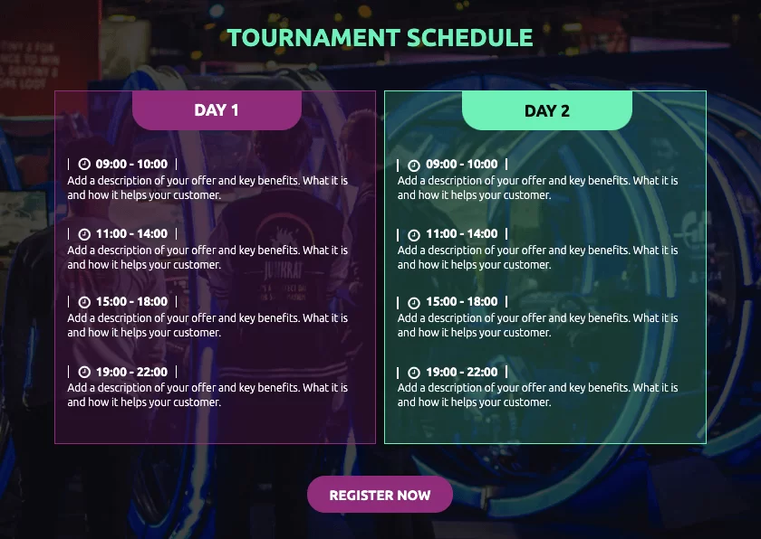 Każde wydarzenie ma swoją strukturę. Jest ona ważna nie tylko dla organizatorów, ale również dla tych, którzy chcą wziąć w nim udział. Niech landing page przedstawia czytelny harmonogram: odwiedzający będą mieli pełen pogląd na przebieg wydarzenia.