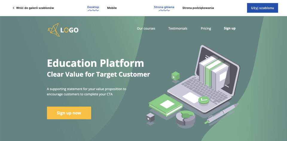 Stwórz podobny landing page z szablonem od Landingi: Education Platform