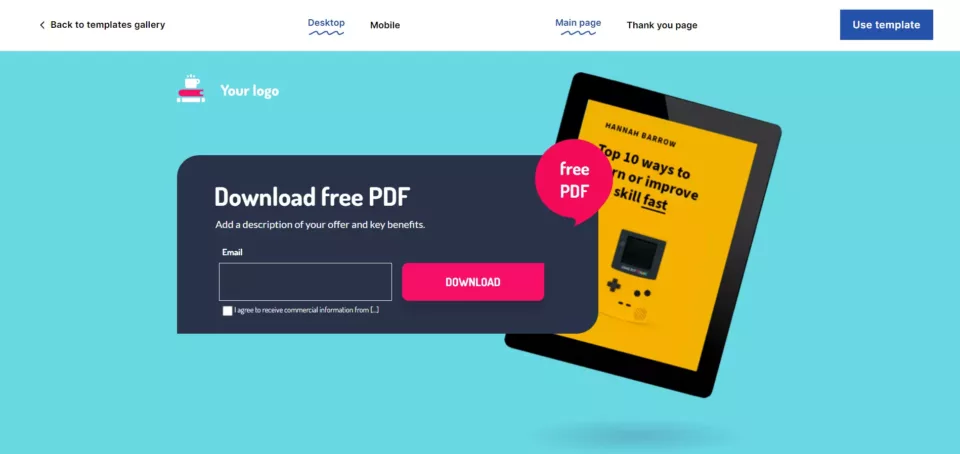 Stwórz podobny landing page z szablonem od Landingi: E-book Download