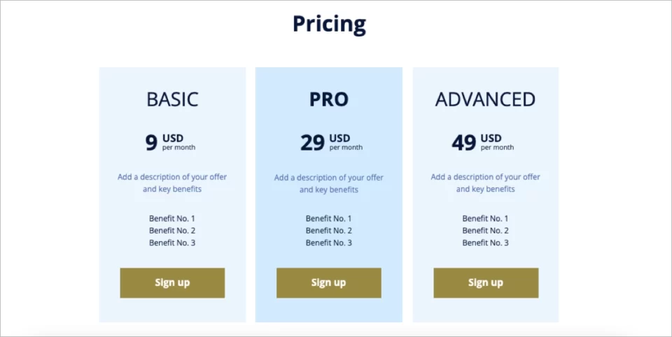 Pick the template that involves a pricing section to streamline the landing page creation process, or use Landingi’s builder to implement a section that informs about the product plans available.