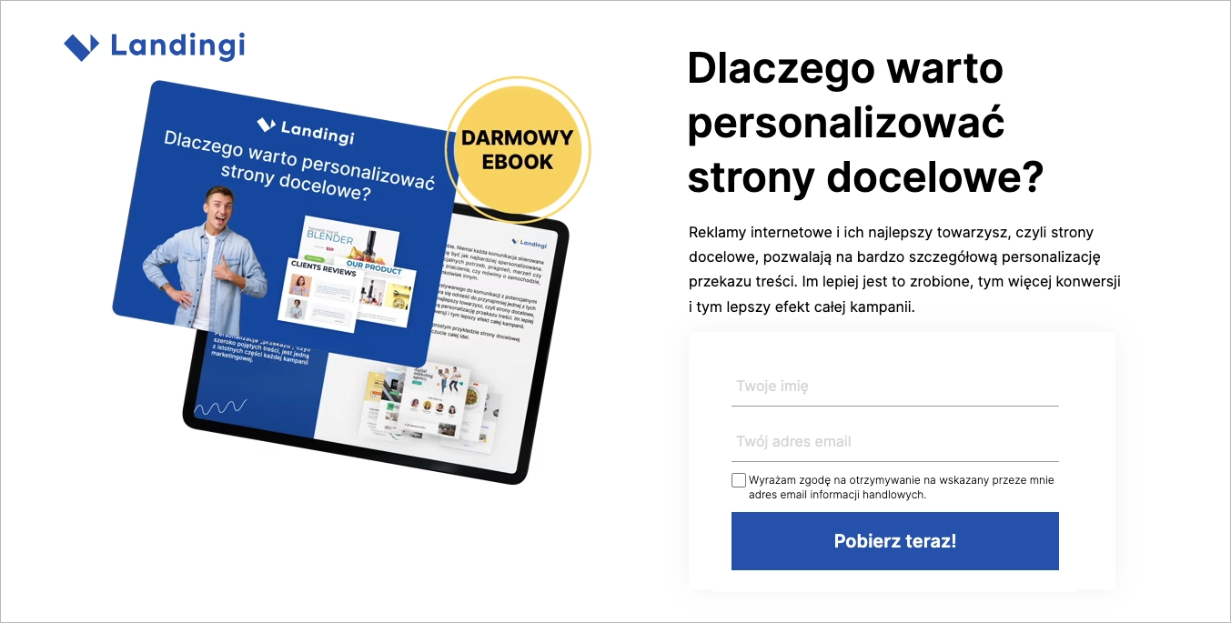 Landingi to firma z branży SaaS, która dostarcza dostarcza rozwiązania programowe dla marketingu cyfrowego. Ich głównym narzędziem jest kreator landing page’y z dodatkowymi funkcjami, które umożliwiają tworzenie, dostosowywanie i publikowanie stron docelowych, śledzenie zachowań użytkowników, zbieranie istotnych danych, analizowanie ich i przeprowadzanie testów A/B w celu optymalizacji konwersji. Strona ebooka została stworzona, aby podzielić się wskazówkami i wartości z personalizacji landing page’y. Prosta, nieskomplikowana i dobrze zaprojektowana strona docelowa pokazuje najlepsze praktyki, których można się nauczyć, aby stworzyć własny landing page o wysokiej konwersji.