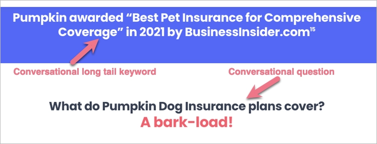 Przykładem może być to, jak Pumpkin podkreśla, że w 2021 r. otrzymał nagrodę “Best Pet Insurance for Comprehensive Coverage” od BusinessInsider.com. Zwiększa to ich autorytet, gdy ktoś wyszukuje przez pytanie “Jakie jest najlepsze ubezpieczenie dla zwierząt domowych dla kompleksowej ochrony?”.