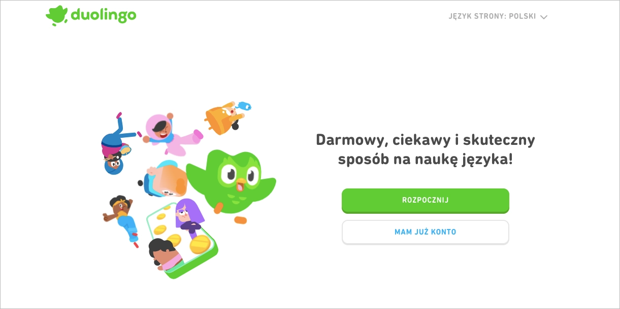 Strona internetowa Duolingo wykorzystuje perswazyjny copywriting, który skutecznie łączy język motywacyjny z jasnymi, opartymi na korzyściach komunikatami, aby zaangażować i przekonwertować odwiedzających. Strona główna otwiera się odważnym i zachęcającym stwierdzeniem: “Darmowy, ciekawy i skuteczny sposób na naukę języka!”. Nagłówek ten jest skuteczny w swojej prostocie, natychmiast odpowiadając na trzy kluczowe obawy użytkowników: koszt (darmowy), doświadczenie (ciekawy) i wynik (skuteczny). Używając bezpośredniego, zwięzłego języka, Duolingo wprowadza pozytywny i przystępny nastrój, sprawiając, że nauka języka wydaje się dostępna dla każdego.