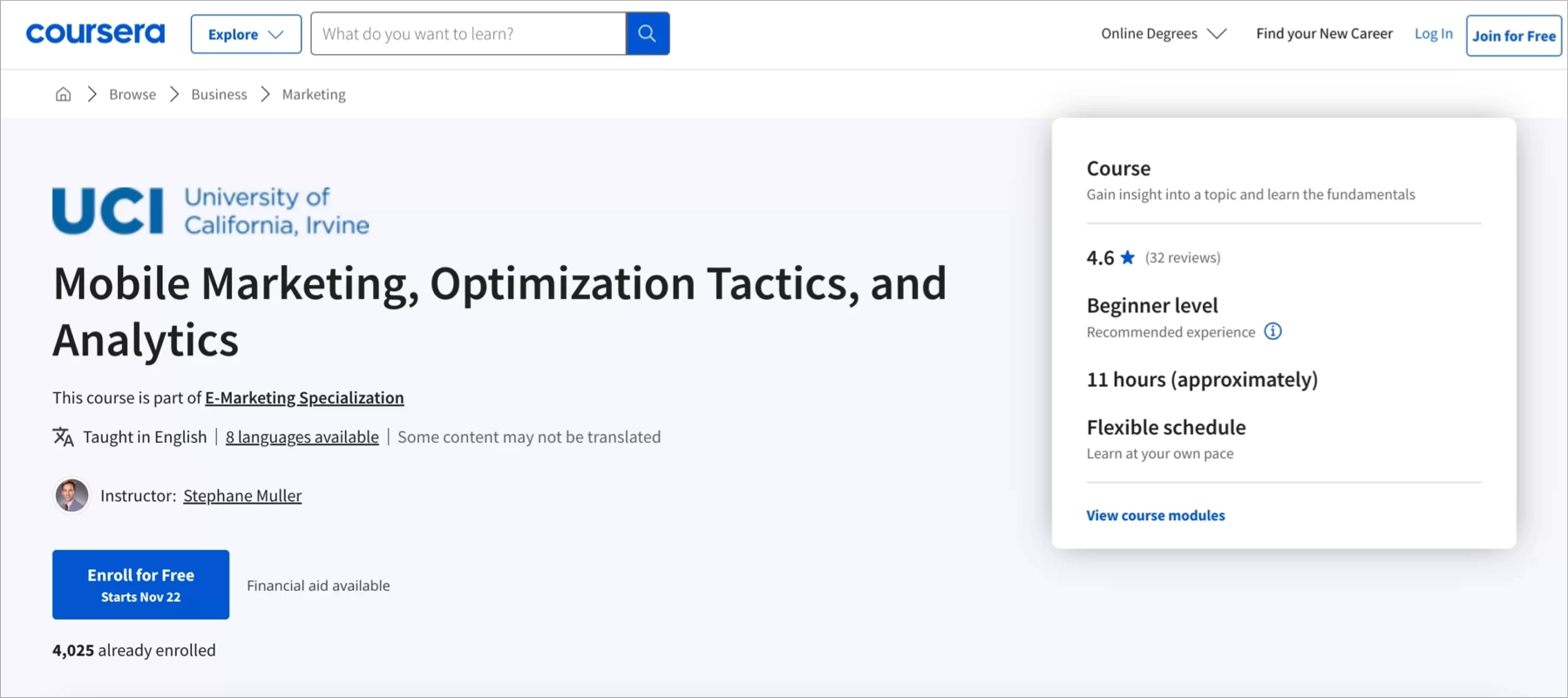9. Kurs marketingu mobilnego, taktyk optymalizacji i analityki Uniwersytetu Kalifornijskiego