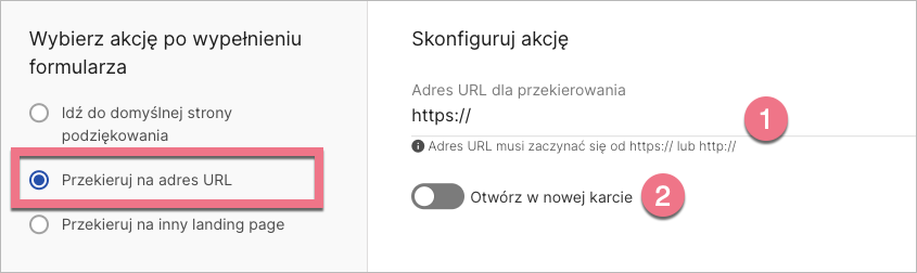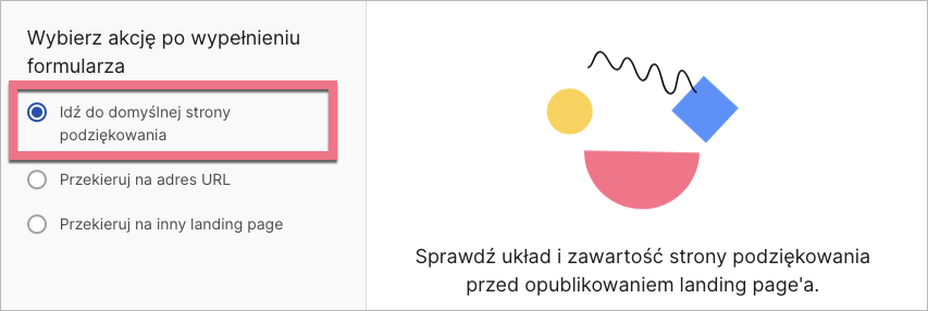 W Landingi możesz zdecydować, jaka akcja wydarzy się po wypełnieniu formularza przez użytkownika. W ustawieniach formularza landing page’a możesz wybrać jedno z trzech przekierowań: