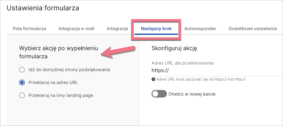 3. W zakładce Następny krok z rozwijanego menu wybierz akcję, która ma się wydarzyć po wypełnieniu formularza przez użytkownika.