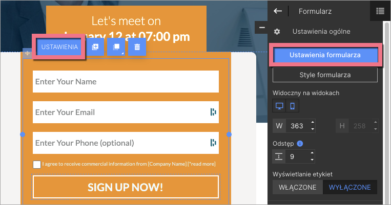 2. Kliknij w formularz i wejdź w jego Ustawienia.