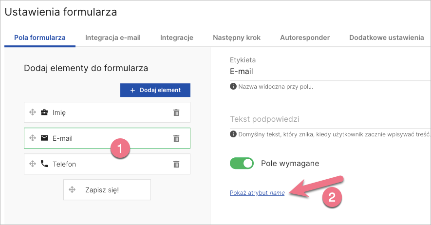 2. W zakładce Pola formularza wybierz interesujące Cię pole (1), a następnie kliknij Pokaż atrybut name (2).
