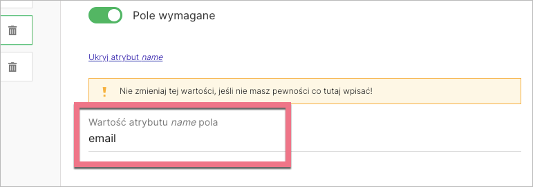 Podczas tworzenia integracji to atrybut name dopasowuje się do danej integracji, a nie odwrotnie. To oznacza, że po zintegrowaniu formularza z zewnętrznym narzędziem to narzędzie nadpisze (zmieni) atrybut name i nada mu swoją wartość. Wartość atrybutu name pola pozostaje więc taka, jaką narzuca integracja, i jako użytkownik nie jesteś w stanie tego zmienić, dopóki narzędzia są połączone.