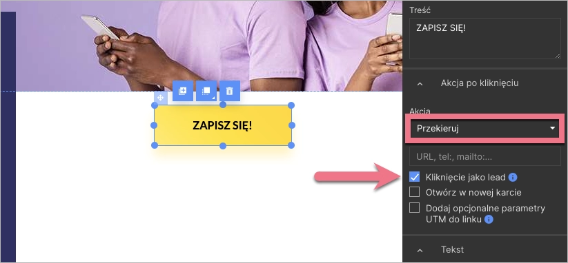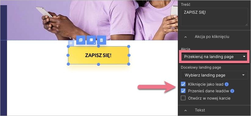 3. Wybierz Przekieruj lub Przekieruj na landing page i zaznacz Kliknięcie jako lead. Jeżeli dany landing page jest częścią lejka, zaznacz także Przenieś dane leadów.