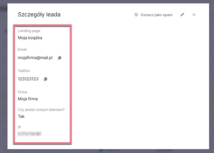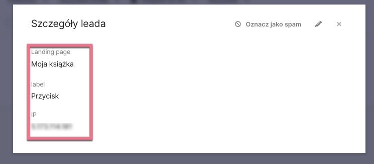 Lead przycisku z aktywną opcją śledzenia kliknięć jako konwersji zawiera jedynie nazwę landing page’a, etykietę przycisku oraz IP.