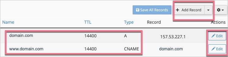 1. Dodaj dwa rekordy A (+ Add Record): jeden dla domeny głównej i jeden dla subdomeny www. Jeśli masz już te rekordy, edytuj ich wartości (oraz Type, jeśli jest ustawiony na CNAME). Nowe rekordy zostaną dodane na samym dole listy.