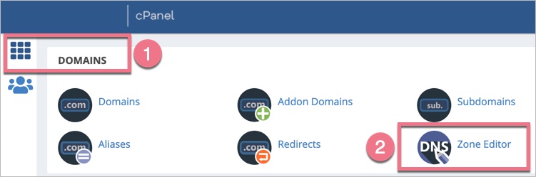 2. Kliknij w Domains (1) i przejdź do zakładki Zone Editor (2).