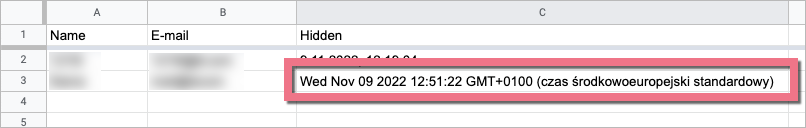 Aby w szczegółach leada (otrzymanych przez integrację e-mail lub przesyłanych do pozostałych integracji formularzowych) znajdowała się data i godzina wypełnienia formularza na Twoim landing page’u, należy do formularza dodać pole ukryte, a następnie dodać jeden z dwóch kodów JavaScript. W zależności od kodu data będzie miała jeden z dwóch formatów: szczegółowy, tzn. Mon Jan 01 2021 12:00:00 GMT+0100 (czas środkowoeuropejski standardowy) bądź tylko datę i godzinę, tzn. 01.01.2021, 12:00:00.