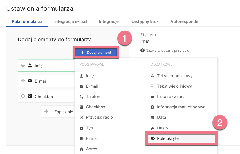 2. Otwórz Ustawienia formularza. Kliknij Dodaj element (1) i wybierz Pole ukryte (2). Następnie Zapisz i zamknij.