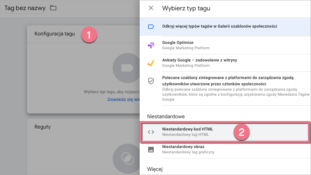 2. Kliknij w dowolne miejsce w obszarze pola Konfiguracja tagu (1), a następnie wybierz z menu, które się pojawi, opcję Niestandardowy kod HTML (2).