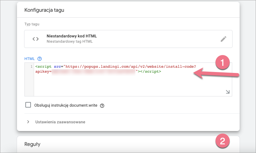 3. W oknie, które się otworzy, wklej w pole HTML (1) kod pop-upu wygenerowany wcześniej w opcjach wyświetlania pop-upu.