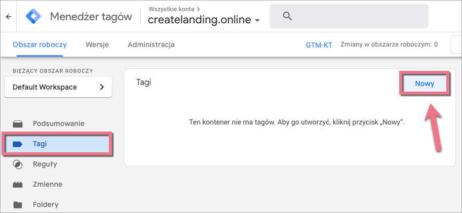 1. Zaloguj się na swoje konto w GTM i przejdź do zakładki Tagi w menu po lewej. Dodaj nowy tag, klikając przycisk Nowy.