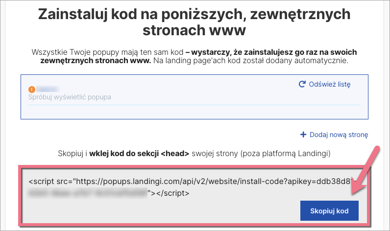 1. Podczas tworzenia pop-upu, po ostatnim kroku jego publikacji (jeżeli wybierzesz publikację na zewnętrznej stronie) wystarczy, że klikniesz Skopiuj kod.