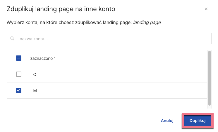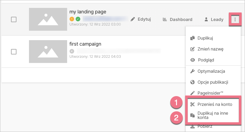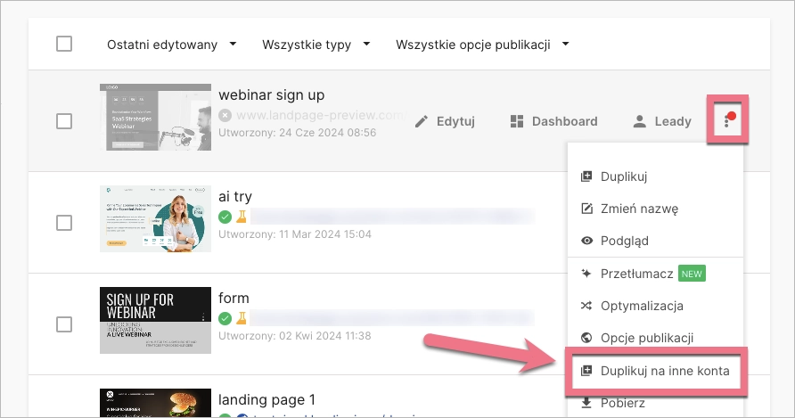 1. Na liście landing page’y kliknij w więcej, a następnie Duplikuj na inne konta.