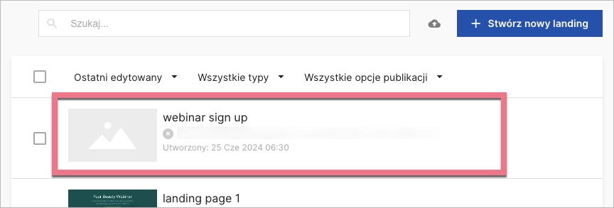 Duplikacja to utworzenie kopii landing page’a. Jest ona przydatna, kiedy chcesz stworzyć landing page o podobnym wyglądzie lub układzie.