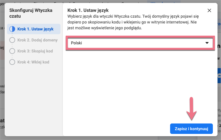 4a. Wybierz język czatu i kliknij Zapisz i kontynuuj.