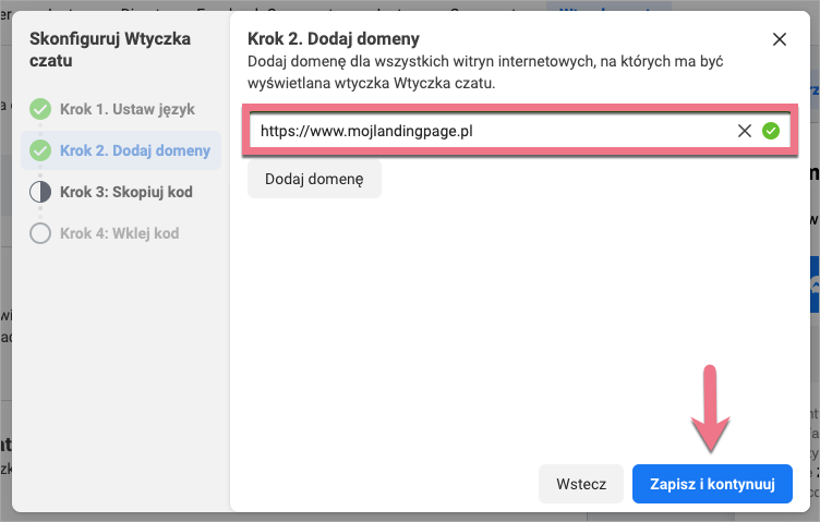 4b. Dodaj domenę, na której znajduje się Twój landing page. Możesz dodać więcej domen, klikając Dodaj domenę. Na koniec Zapisz i kontynuuj.