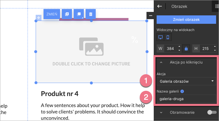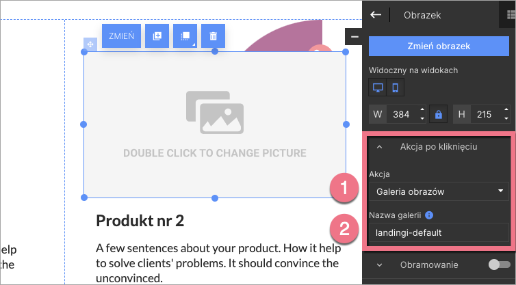 2. Kliknij w widget Obraz – po prawej stronie wyświetli się panel boczny. W zakładce Akcja po kliknięciu wybierz Galeria obrazów (1). Wybrany obraz zostanie przypisany do galerii, która automatycznie zostanie nazwana landingi-default (2).