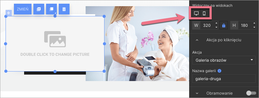 2. W toolbarze po prawej stronie zmień widoczność wybranych obrazów, wyłączając ją dla obu widoków (desktopowego i mobilnego). Obrazy nie będą widoczne ani w edytorze, ani na landing page’u, będą jednak wyświetlane w galerii.