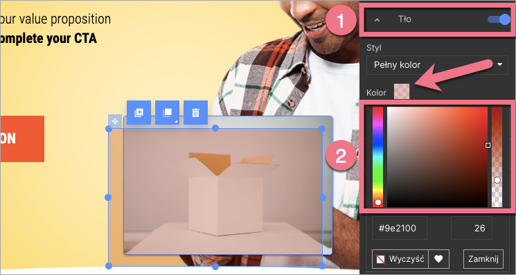 2. Dostosuj jego wielkość i położenie. Przejdź do toolbaru po prawej stronie i włącz zakładkę Tło (1). Kliknij w pole wyboru koloru. Następnie wybierz kolor i zmień jego transparentność (2).