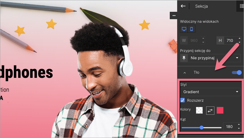 Jeżeli chcesz dodać do obrazu w tle sekcji filtr gradientowy, dodaj obraz w tle strony, a następnie w opcjach sekcji wybierz Gradient jako styl tła.